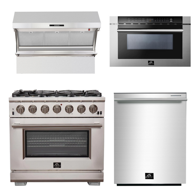 The Forno Appliance Package - 36 in. Pro Gas Range with 6 Defendi Italian Burners in Stainless Steel, Wall Mount Range Hood, 60 Inch Refrigerator, Microwave Drawer, and Dishwasher. This appliance bundle is perfect for your next kitchen model, and comes at a highly affordable price! Read more below!