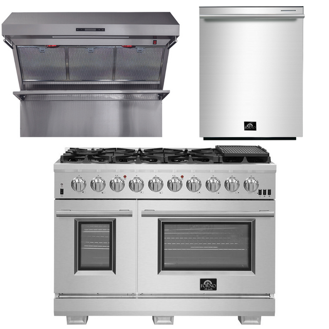 The Forno Package - 48 in. Pro Range with 8 Defendi Italian Burners in Stainless Steel, Savona Wall Mount Range Hood with Back Splash, and Dishwasher. This appliance package is perfect for your next kitchen model, and comes at a highly affordable price! Read more below!