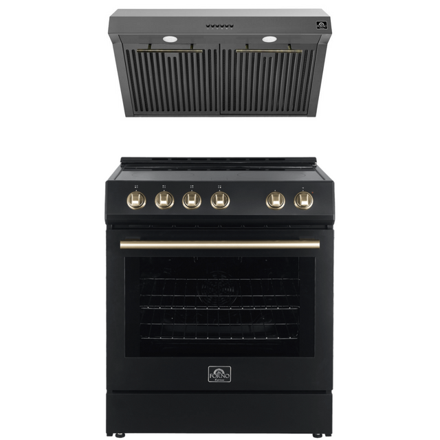 FORNO Espresso Package - 30" Electric Range and Range Hood in Black with Antique Brass Handles, FBDL-002-02US