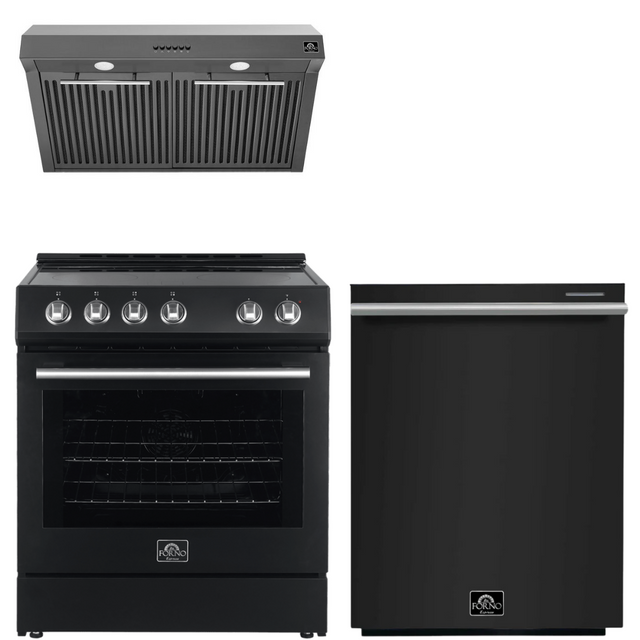 FORNO Espresso Package - 30" Electric Range, Range Hood and Dishwasher in Black with Silver Handles
