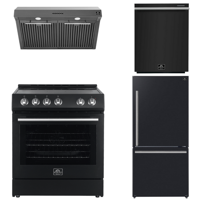 FORNO Espresso Package - 30" Electric Range, Range Hood, Refrigerator and Dishwasher in Black with Silver Handles, FBDL-006-02US