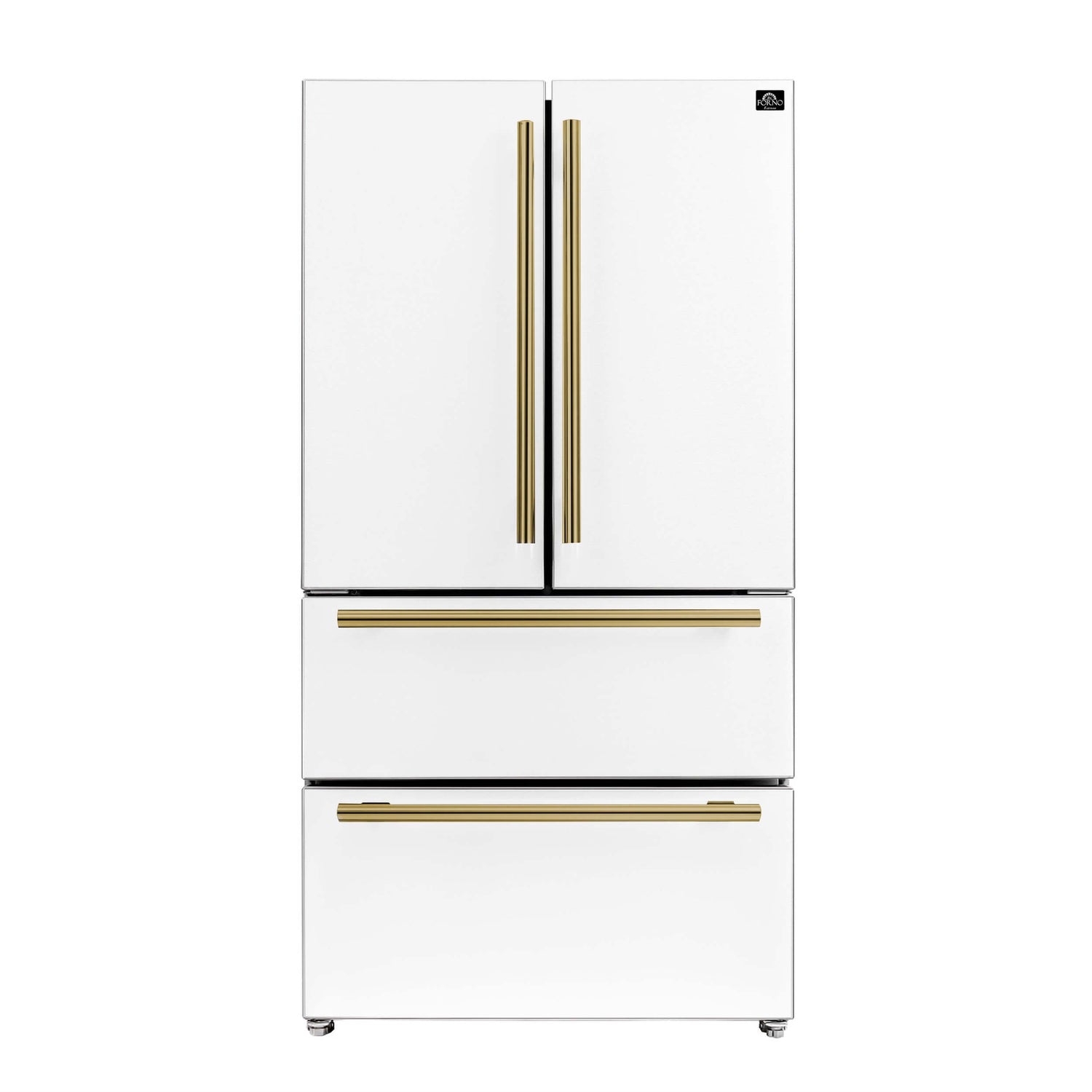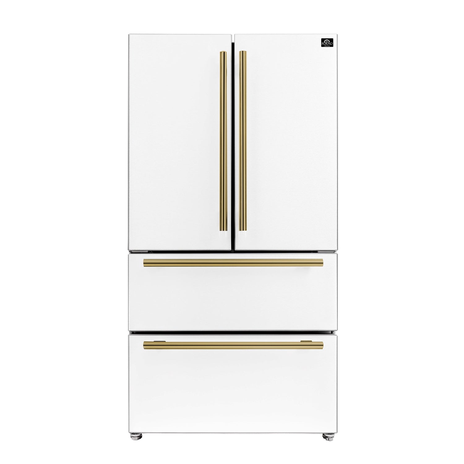 FORNO Espresso Moena 36" 19.2 cu. ft. Refrigerator with Ice Maker in White with Antique Brass Handles, FFRBI1820-36WHT