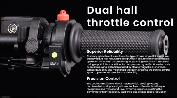 Presently, worldwide electric motorcycles generally utilize single Hall configuration. We implement a dual Hall redundant architecture, which guarantees continuous dependable operation through an automatic signal switching mechanism during a single-path malfunction. Furthermore, complementary verification effectively minimizes signal distortion resulting from electromagnetic interference, temperature fluctuation, and mechanical vibration, ensuring the throttle control system functions with accuracy and stability.