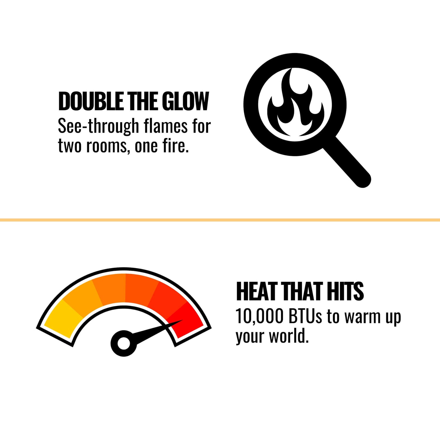 Experience unparalleled comfort with independent heating controls for each side, ensuring perfect temperatures in both rooms. From the soft glow of the NIGHT LIGHT to the vibrant hues of the flame, every detail is meticulously crafted to create an ambiance that's as unique as you are. And with the option to personalize your fireplace with either sparkling crystal media or hand-painted logs, your space will truly become an extension of your style.