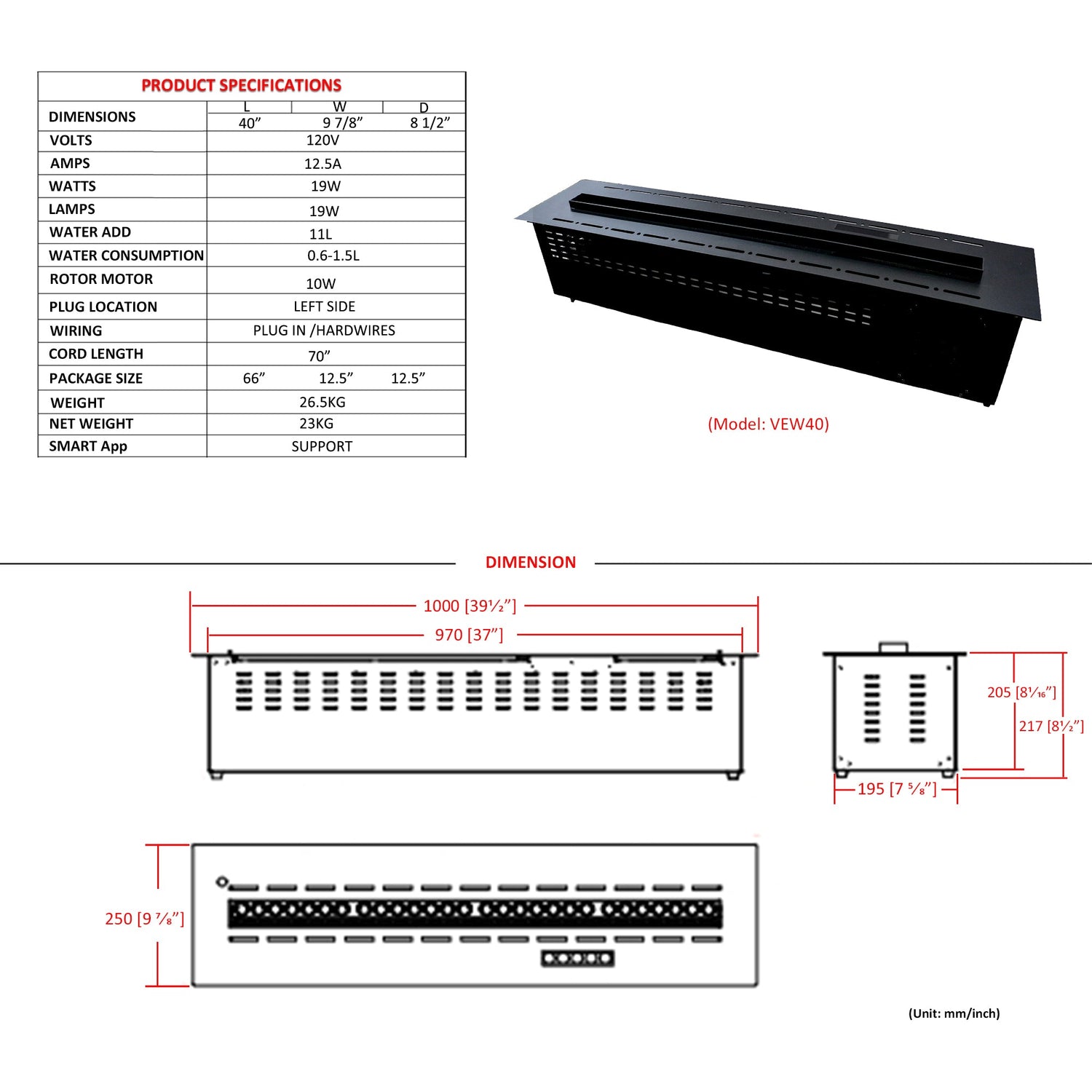 Litedeer Homes Mercury 40-inch 3D Water Vapor Fireplace Cassette with Smart Fireplace App, Multi-colour Flame & Remote Control (Model: VEW40A or VEW40M) - 40 Inch is backordered and will ship as soon as it is back in stock.