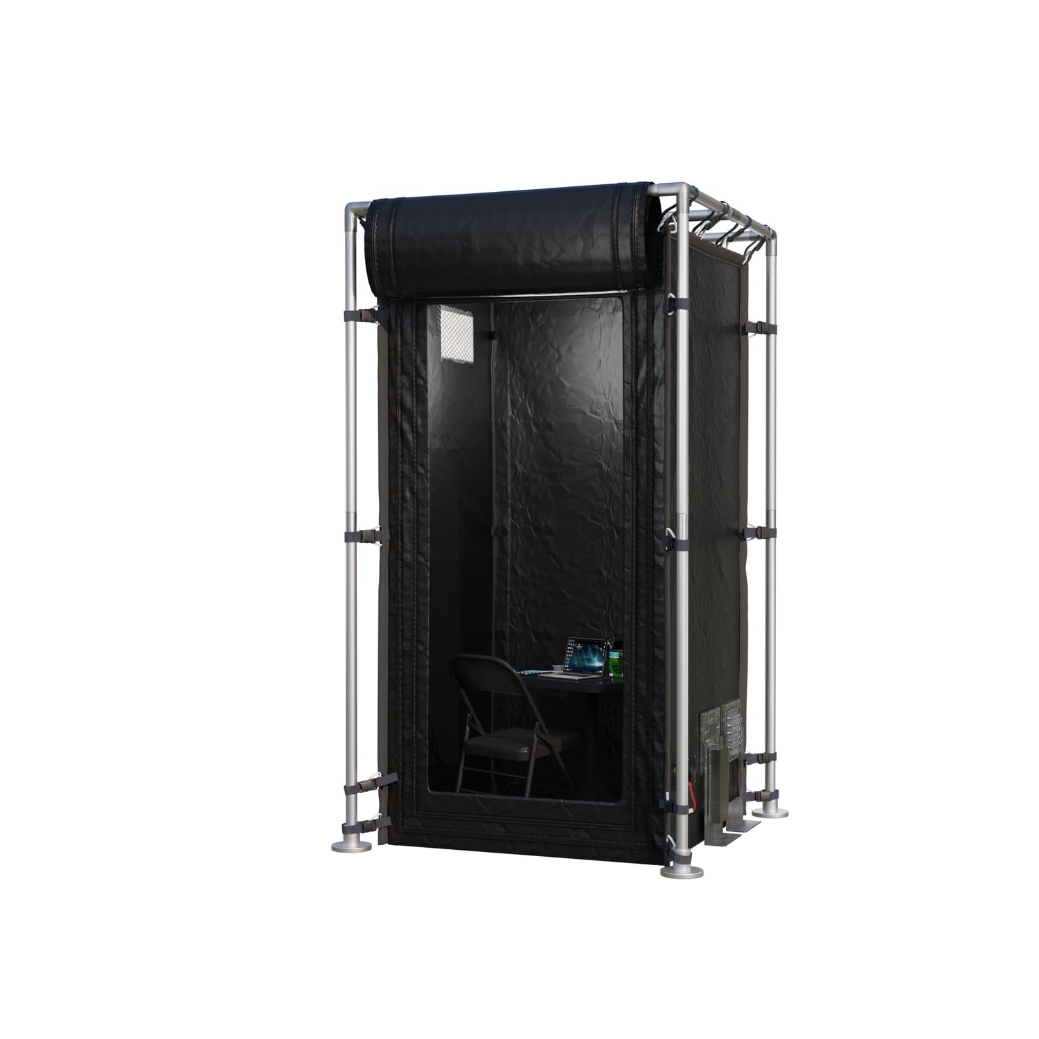 With 104 cubic feet of space, the tent fits an operator and a small desk. Transmitters are blocked, ensuring secure communication. Each tent features double-wall construction, double mag/zip doors, positive air ventilation, and shielded power, Ethernet, and LED lighting.