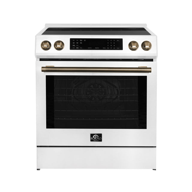 FORNO Espresso Donatello 30" 5 cu. ft. Induction Range with Air Fry and Self-Clean in White and Antique Brass Handles, FFSIN0905-30WHT