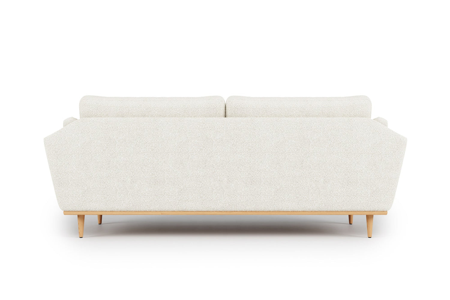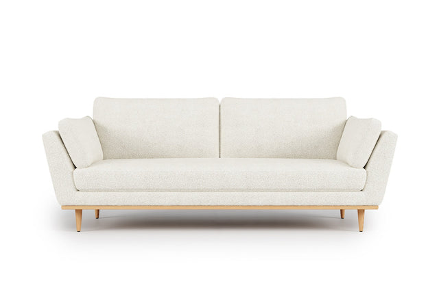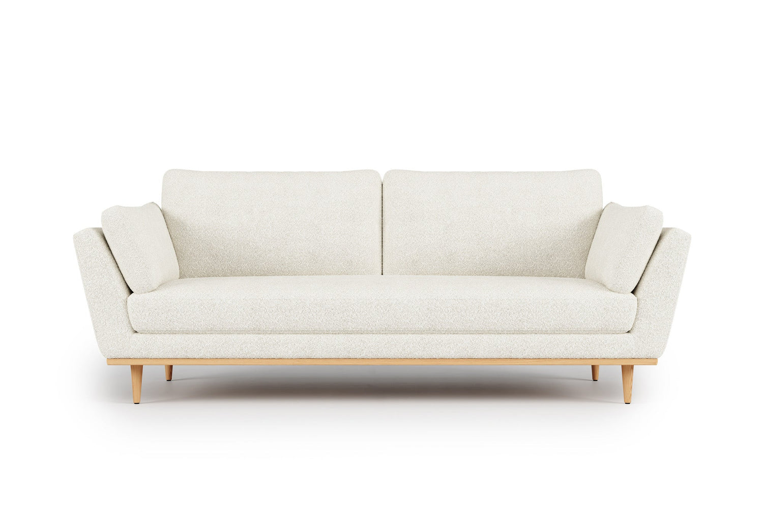 Our contemporary Mila sofa embodies the essence of mid-century modern design. It effortlessly combines distinctive features such as flared arms, tapered conical legs, nested cushions, and a chamfered back, showcasing the timeless chic of this style. The exposed ash legs and rail feature an on-trend bleached oak finish, adding a modern touch to the overall aesthetic.
