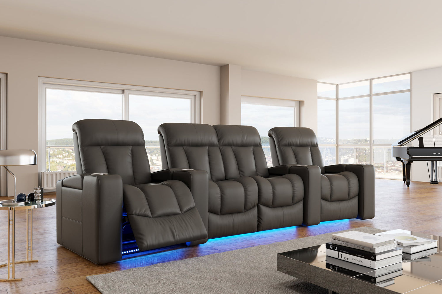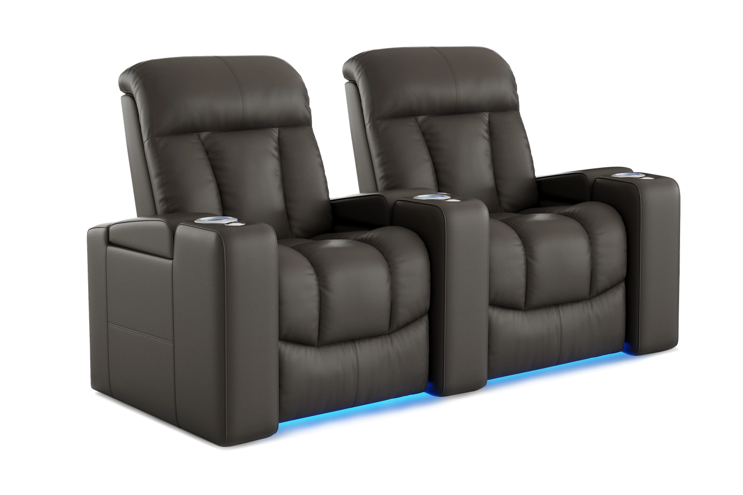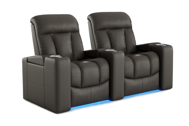 Introducing the Olivia Home Theater Seating, a luxurious addition to any home theatre. Its hallmark is a multi-color LED cupholder, offering seven colors and adjustable brightness for both style and convenience. With integrated power controls, it allows easy adjustment of the recline and headrest, ensuring personalized comfort. Olivia features plush high-back cushions filled with blown fiber and high-resilience foam seating, providing both comfort and support. Versatile in design, Olivia can be arranged in various configurations to fit any space, be it a cozy den or a grand entertainment room. It also boasts ambient ground lighting, enhancing the atmosphere in dim settings. Compatible with a range of accessories, Olivia is designed to meet the dynamic needs of modern entertainment spaces.