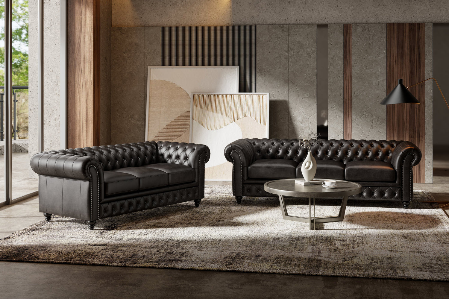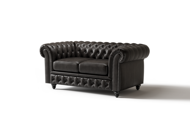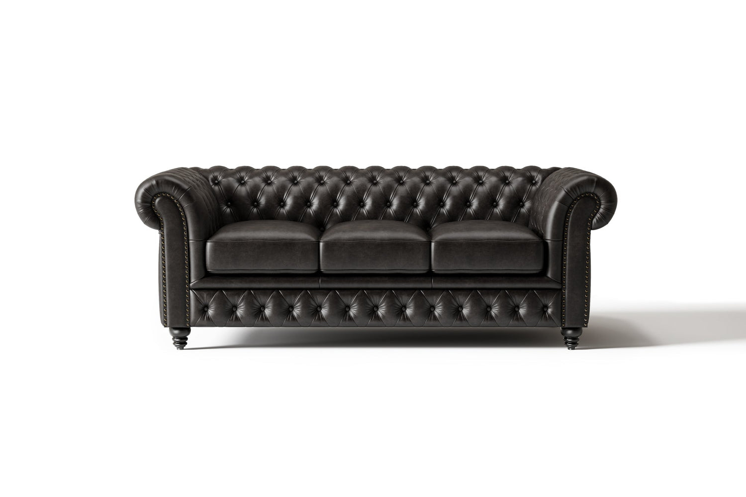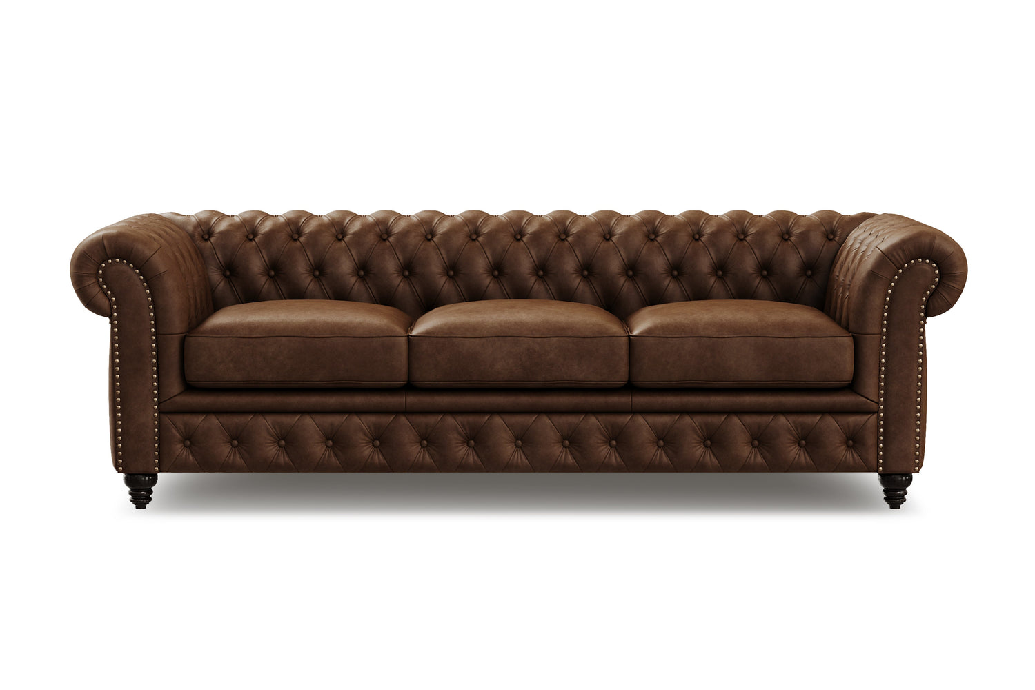 The exquisite Parma Full Aniline Leather Sofa is a true masterpiece of refined elegance. This stunning piece boasts button-tufted back cushions, beautifully accentuated by padded and tufted high-rolled arms and solid wood bun feet. The stately Bronze nail-head trim, intricately hand-applied, adds a final touch of sophistication as it outlines the arms and front rails. Immerse yourself in luxury with our grand three large-seater sofa, offering an expansive width to accommodate your every lounging desire. This Sofa exemplifies the perfect blend of exquisite craftsmanship, lasting comfort, and timeless elegance, making it an exceptional addition to your living space.
