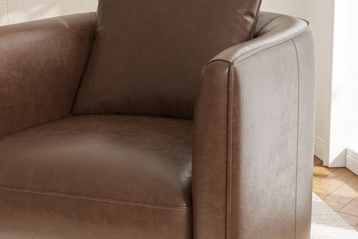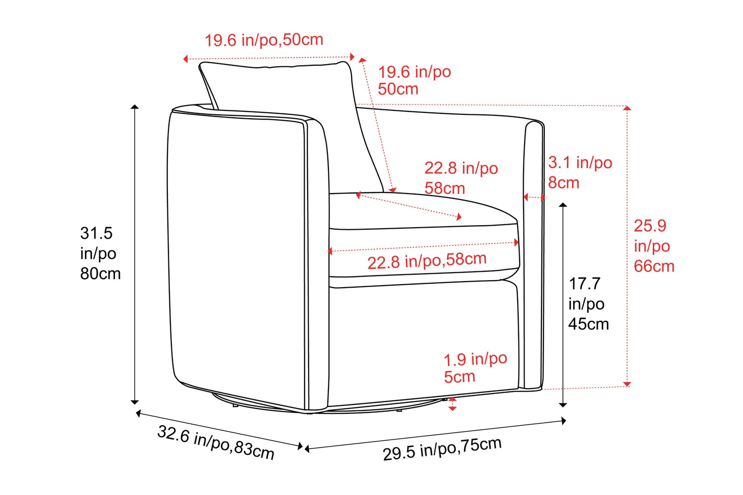 Expertly crafted with precise detailing, the Riley swivel chair boasts a dynamic presence. Its design features a welcoming barrel-shaped back, offering a cozy embrace. The chair is luxuriously furnished with a soft, cushioned seat for added comfort. Its compact yet elegant proportions make it ideal for pairing or grouping, enhancing the functionality and style of small apartments, media spaces, or intimate conversation areas in a living space.