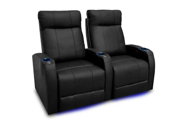Incredibly sleek, slim, and comfortable, the Syracuse is designed to give you plenty of space in your home cinema without sacrificing comfort. The Syracuse reclining home theater chairs comes with LED cup-holders, ambient base lighting, premium top grain 9000 leather on all seating surfaces, and motorized recliner mechanisms. The Syracuse will immerse you into your viewing experience like no other leather-upholstered theater chair has before.