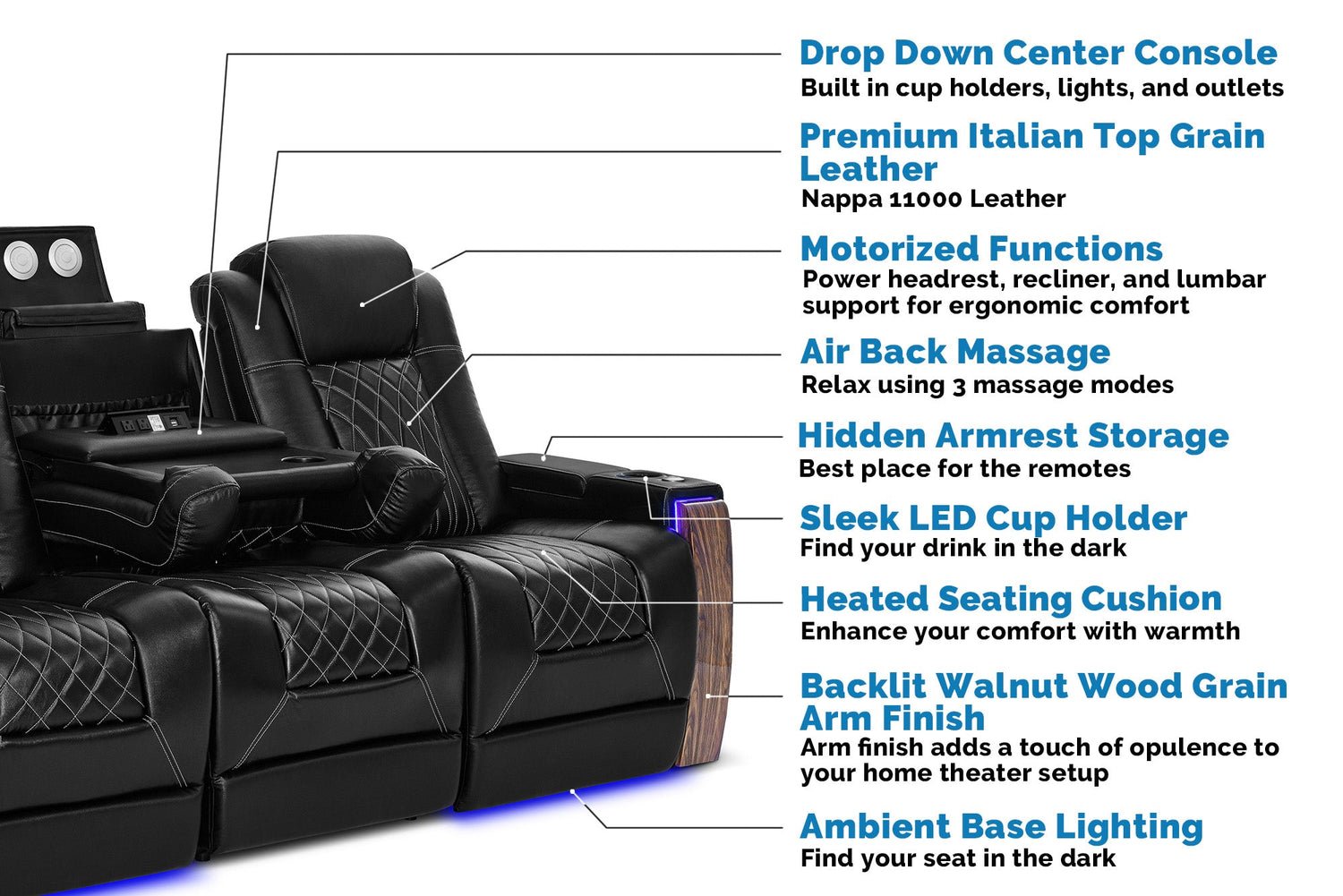 Introducing the 2025 New Tuscany Executive Console Home Theater Seating! Upgrade your home theater with the brand new Tuscany Executive Console with upgraded technology and cutting-edge comfort, A perfect blend of luxury, style, and comfort. This premium recliner is crafted with new imported Italian Nappa 11000 top grain leather on all seating surfaces, offering a smooth and elegant touch. Indulge in the pinnacle of luxury with Valencia’s 2025 Tuscany Executive Console model, now enhanced with heated massage functions on both end seats and a centre console designed to hold your favourite wine and gourmet platter.