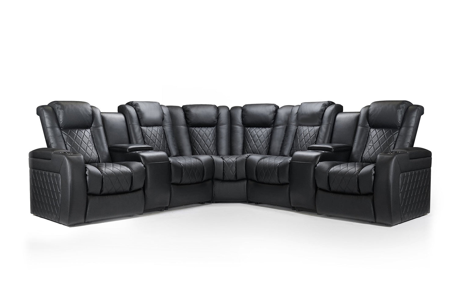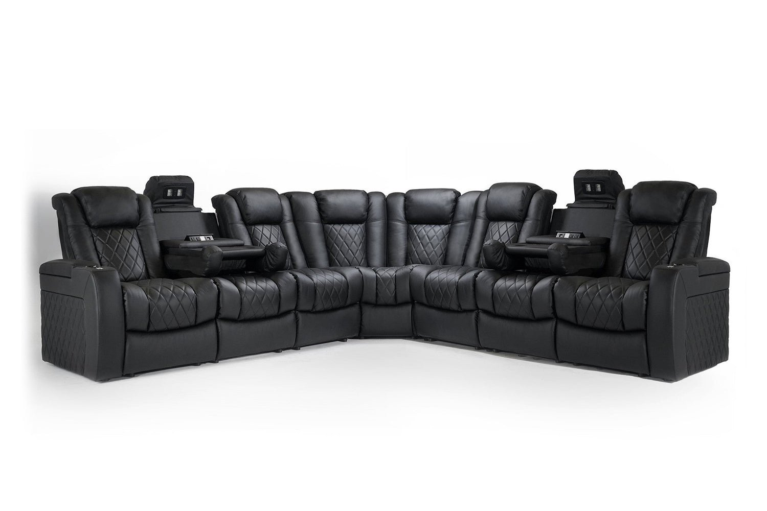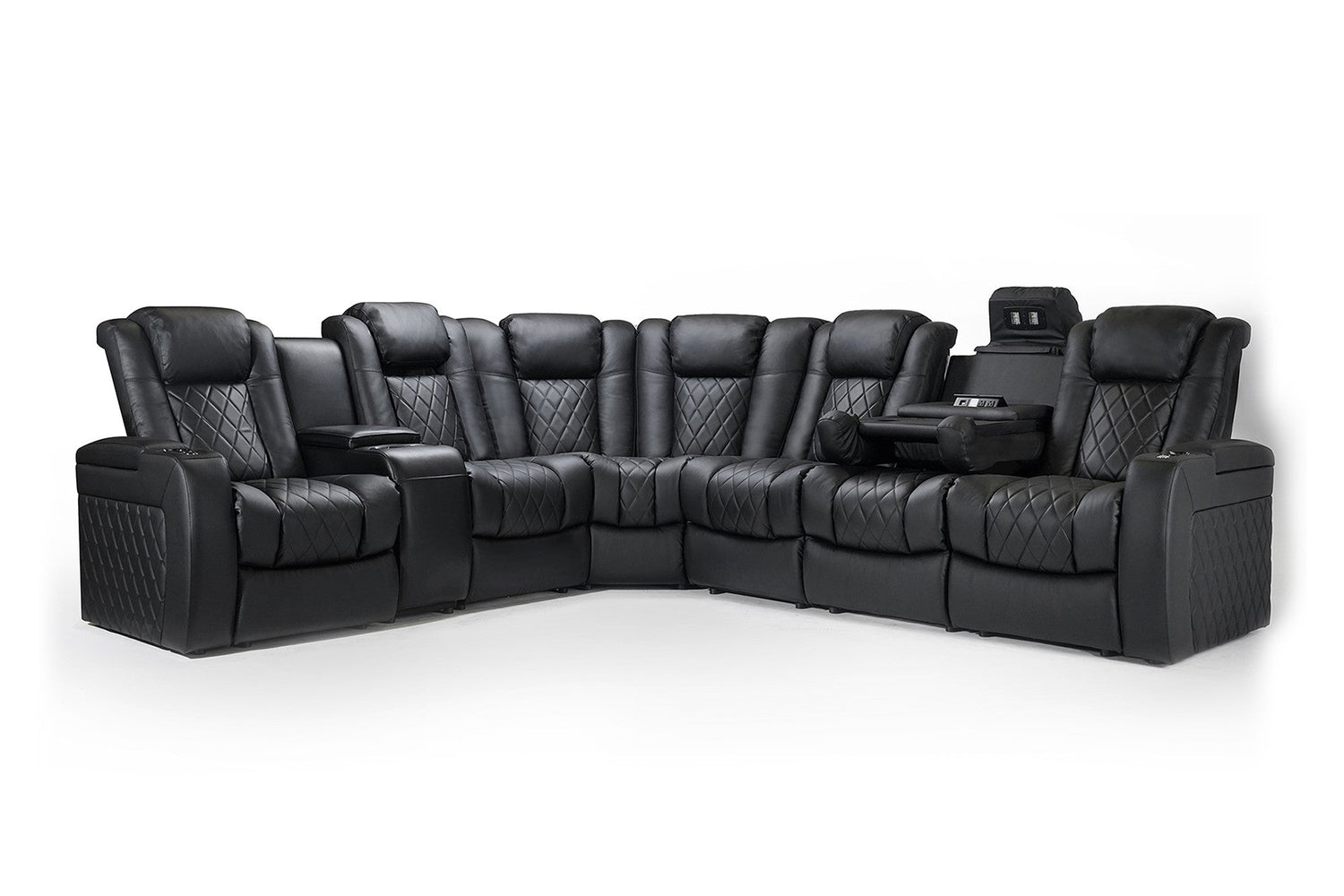 What makes movie night a luxurious experience? Is it the wine, the cozy atmosphere, or the supple feeling of leather as it supports your back as you recline your chair to better enjoy the movie experience? Reclining sectionals with powered lumbar support built for home theaters like The Tuscany Multimedia Sectional can provide you a luxurious experience that will take movie night to the next level of comfort. Get ready to sink into movie night with our top-of-the-line entertainment room sectional sofa. With ample seating, the sectional will be the center of attention for all your guests and friends!