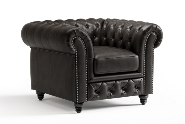 A black leather Chesterfield sofa, showcasing its classic design and luxurious texture.