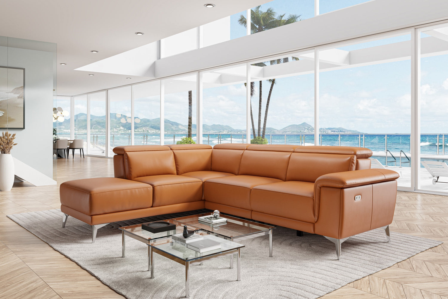 Valencia Pista Modern Top Grain Leather Reclining Sectional Sofa with Left-Hand Facing Chaise, Cognac is backordered and will ship as soon as it is back in stock.