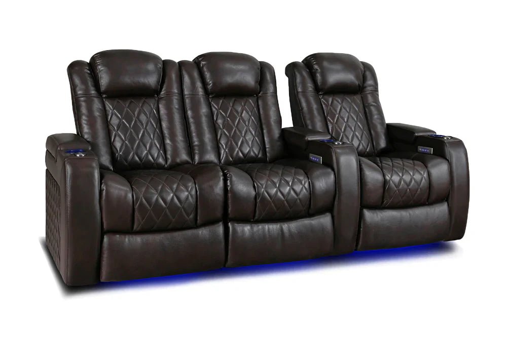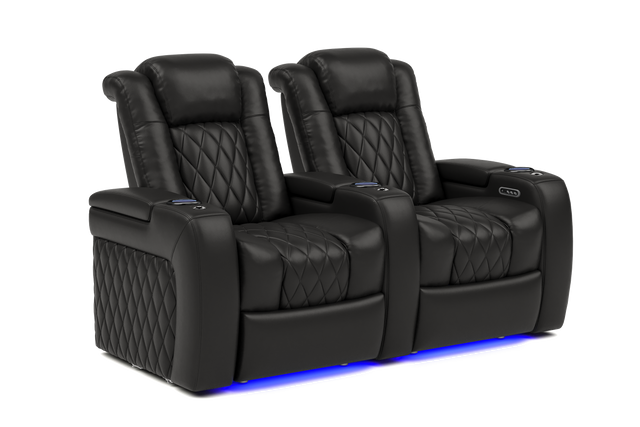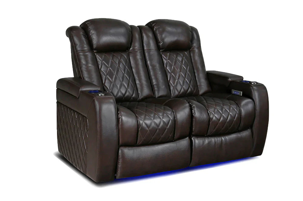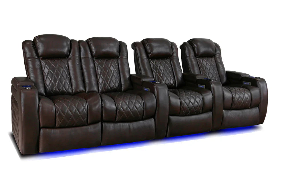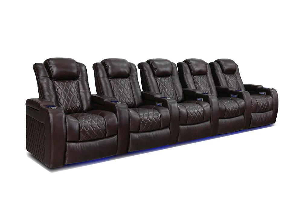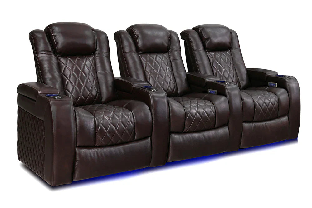 Introducing the 2025 Version of Our Best-Selling Tuscany Home Theater Seating! Upgrade your home theater with the brand new Tuscany 2025 with upgraded technology and cutting-edge comfort, A perfect blend of luxury, style, and comfort. Designed for unmatched relaxation, this premium recliner is crafted with new imported Top-Grain Italian Nappa leather 11000 on all seating surfaces, offering a smooth and elegant touch. Enjoy immersive movie nights with new RGB cup holders with ambient base lighting, and a motorized reclining system that lets you find your perfect seating position effortlessly. The newly upgraded Tuscany now features deeper hidden arm storage, perfect for keeping your accessories close at hand. Plus, an air piston-assisted storage lid ensures smooth and safe operation. Our tactile button control system replaces traditional soft-touch buttons, allowing you to activate all functions simultaneously for an enhanced experience.