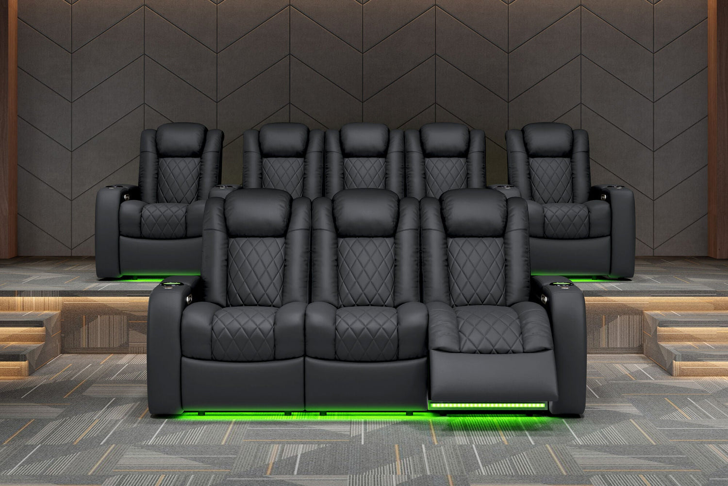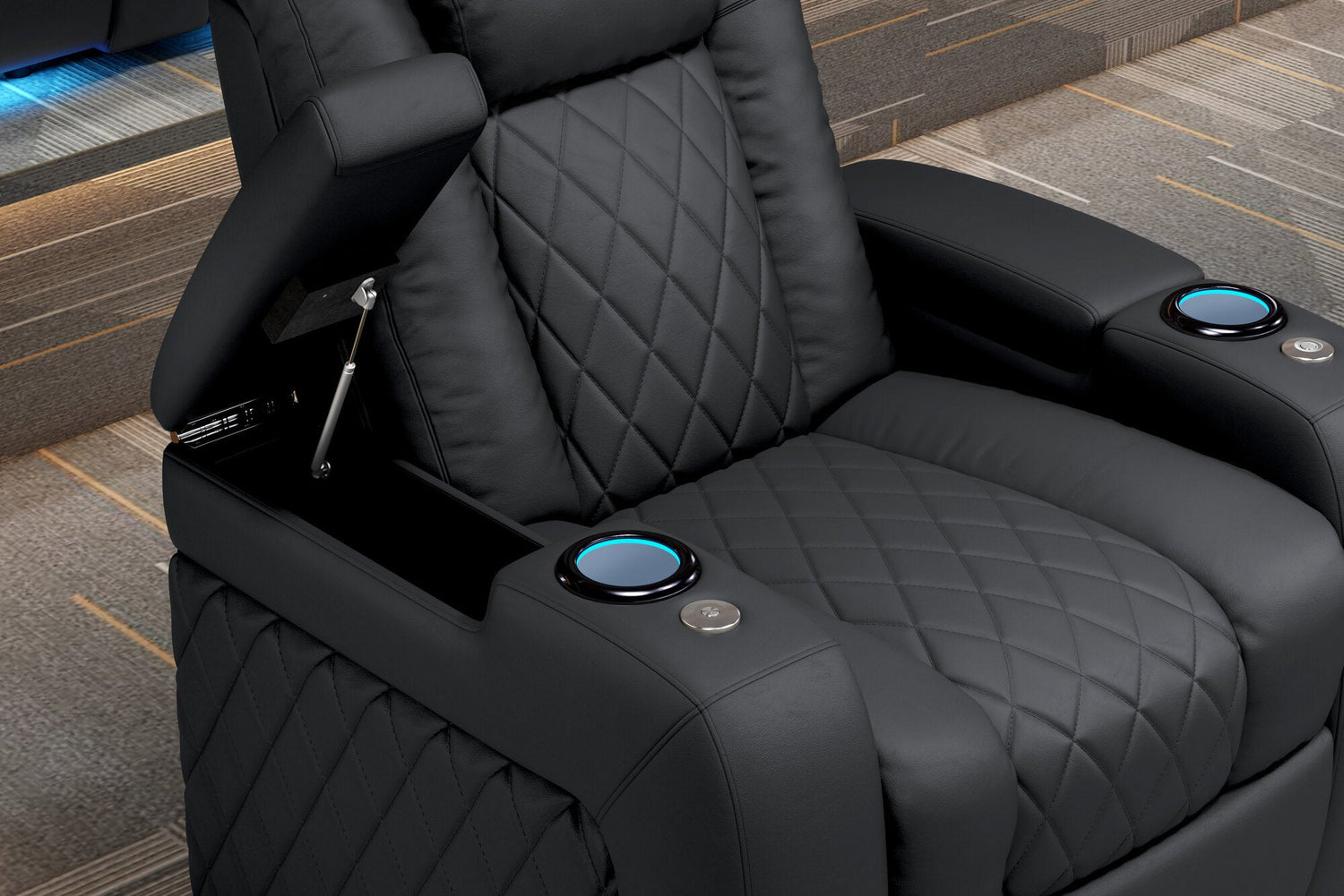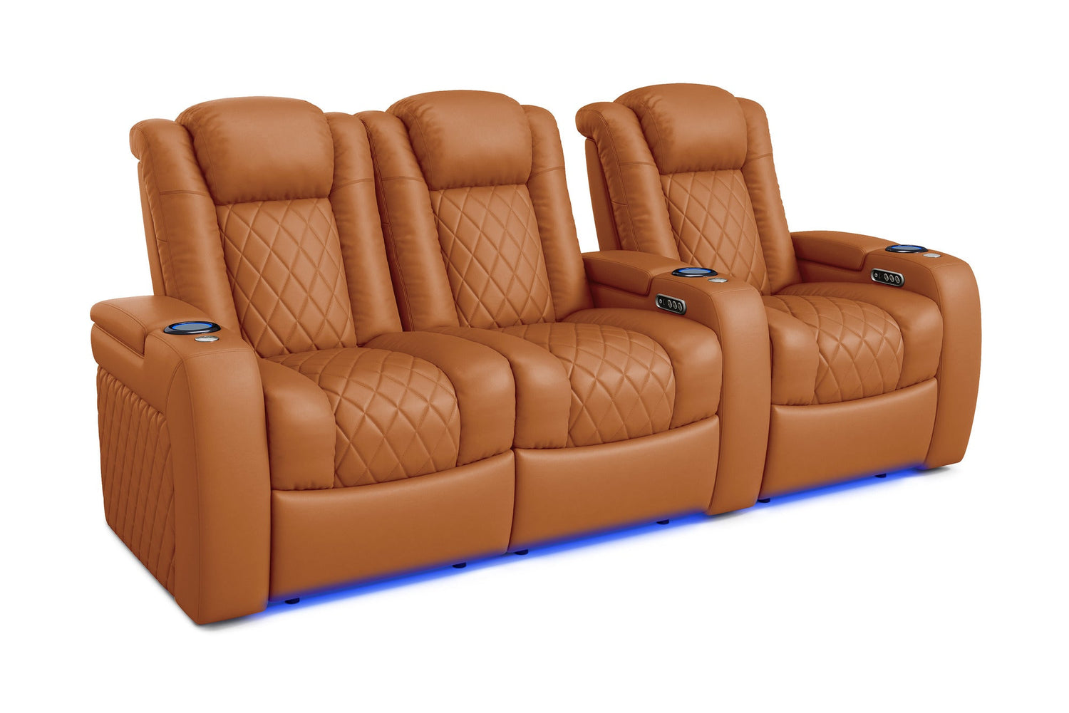 Introducing the 2025 Version of Our Best-Selling Tuscany Home Theater Seating! Upgrade your home theater with the brand new Tuscany 2025 with upgraded technology and cutting-edge comfort, A perfect blend of luxury, style, and comfort. Designed for unmatched relaxation, this premium recliner is crafted with new imported Top-Grain Italian Nappa leather 11000 on all seating surfaces, offering a smooth and elegant touch. Enjoy immersive movie nights with new RGB cup holders with ambient base lighting, and a motorized reclining system that lets you find your perfect seating position effortlessly. The newly upgraded Tuscany now features deeper hidden arm storage, perfect for keeping your accessories close at hand. Plus, an air piston-assisted storage lid ensures smooth and safe operation. Our tactile button control system replaces traditional soft-touch buttons, allowing you to activate all functions simultaneously for an enhanced experience.