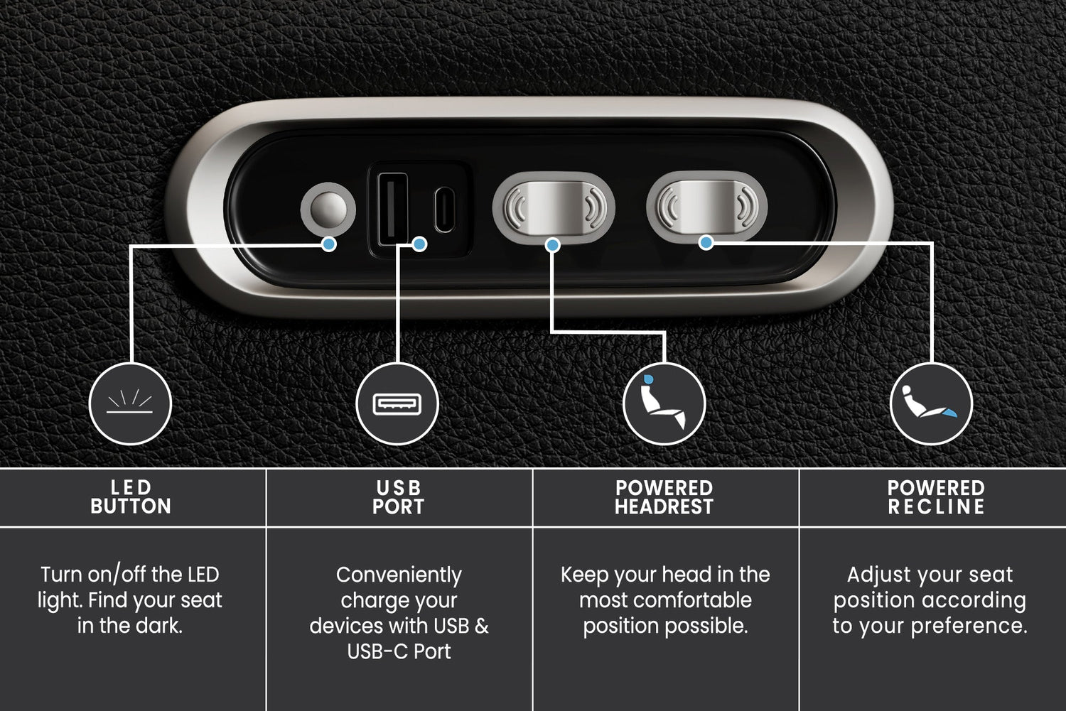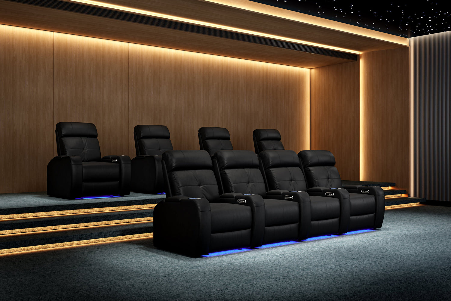 The best in ergonomics, luxury and comfort, the newly upgraded Verona's elegance offers a truly unique home theatre experience for every occasion. With LED cup-holders and ambient base lighting, premium Italian Top Grain Nappa Leather 9000 on all sitting surfaces, a USB outlet, and motorized recliner mechanisms, the newly upgraded Verona will create a memorable home theatre experience every time.