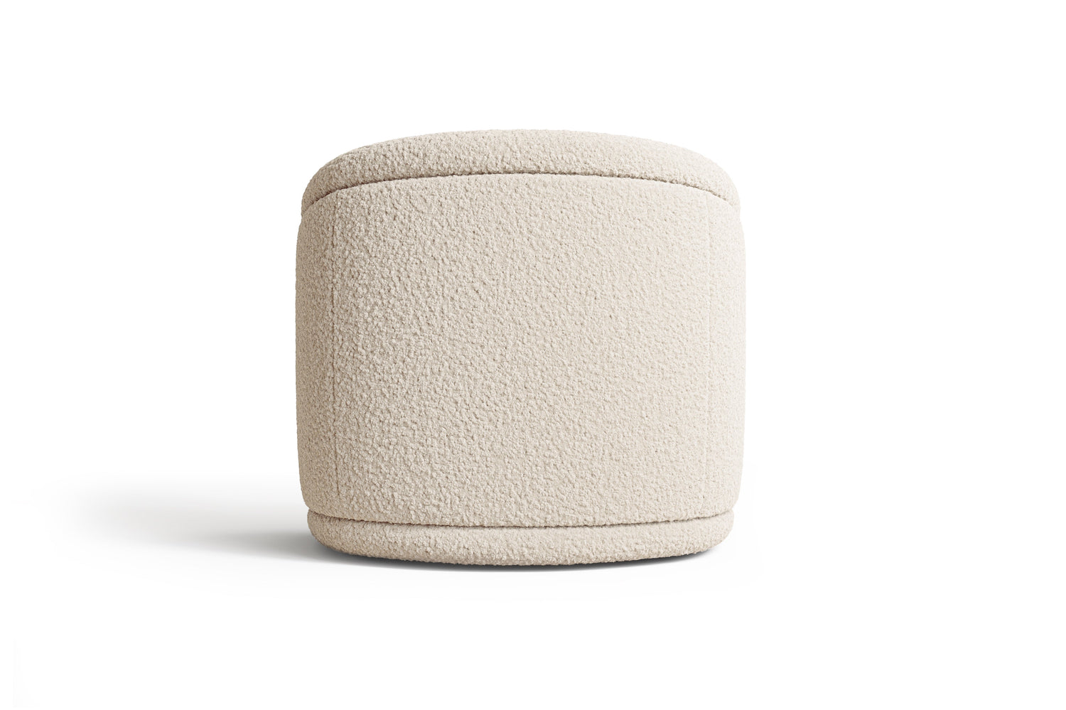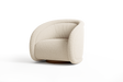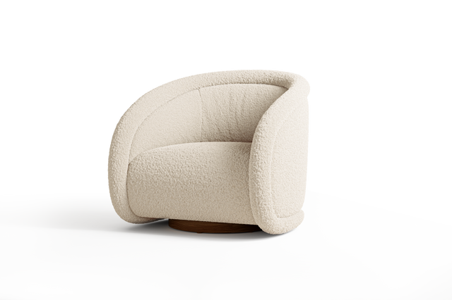 Introducing the Violet chair, a sophisticated and contemporary twist on the classic barrel chair design. This piece is a symphony of comforting curves, blending a timeless aesthetic with modern flair. The Violet chair boasts a rounded silhouette, emphasized by padded channeling that seamlessly flows from the arms, across the back, and down to the base, completing a full loop of elegant continuity. Crafted in a luxurious light beige textured boucle, this chair offers a plush, tight-cushioned seat coupled with a low-profile, enveloping backrest. It rests on a discreetly recessed base, revealing just a hint of wood grain finished in a delicate brown, adding a touch of organic warmth to its appearance.