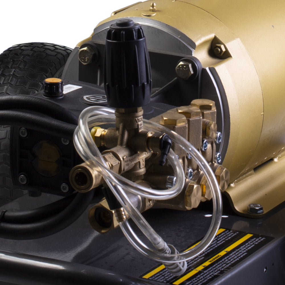 Pump: AR Triplex (die-cast body, forged brass manifold, ceramic-coated plungers, thermal relief valve)