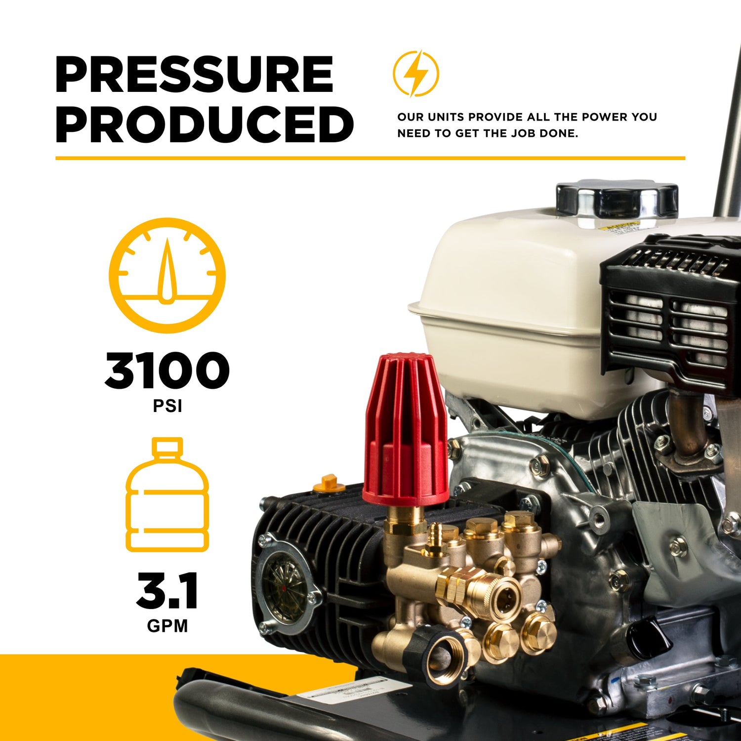 This pressure washer is driven by the Honda GX200, a 196cc engine widely regarded for its smooth operation, easy starting, low emissions, and proven reliability in commercial settings. It delivers consistent power to the pump, keeping output stable at 3,100 PSI and 3.1 GPM, so you get clean results every time.