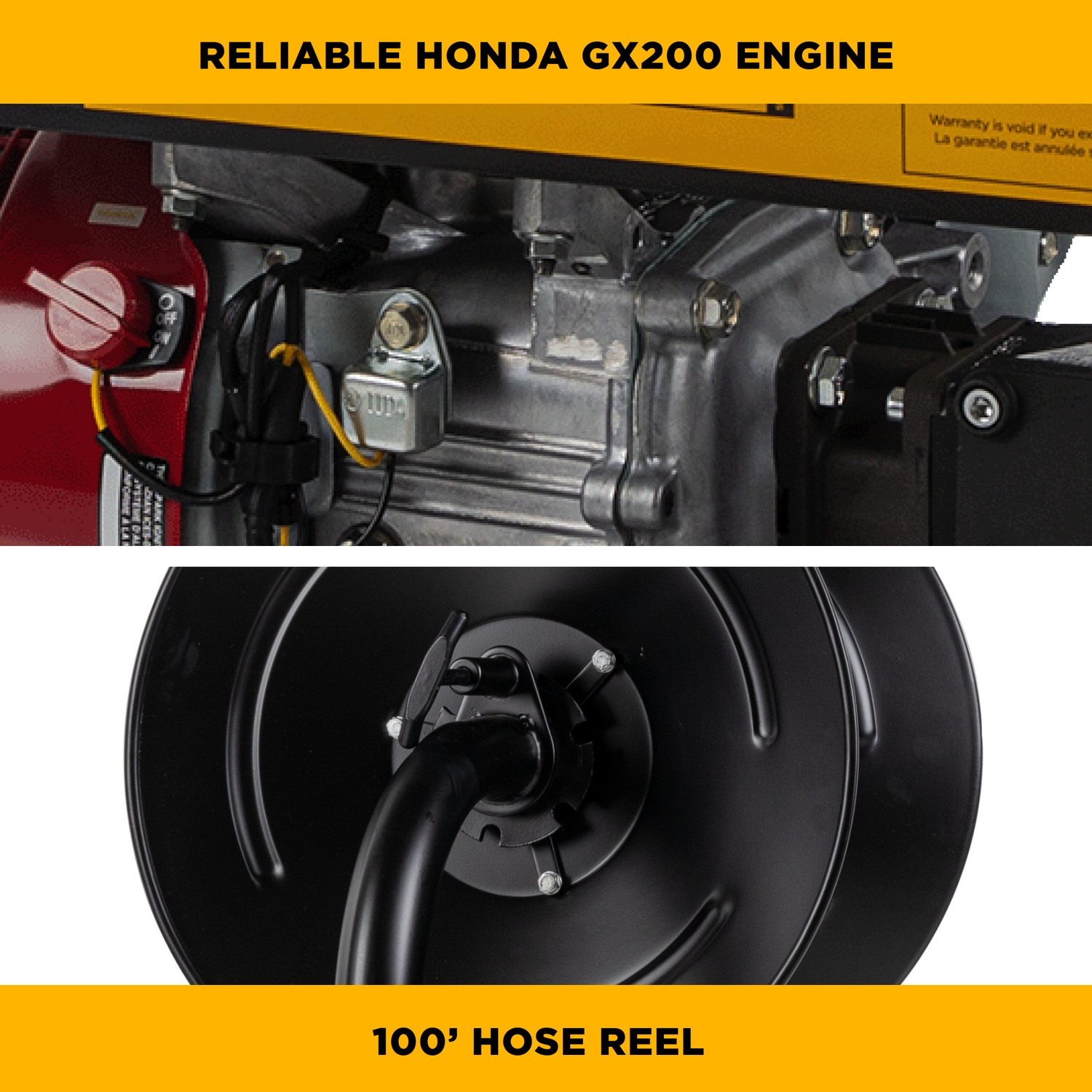 Powered by Honda GX200 engine delivers 3100PSI for tackling your toughest job. The large capacity fuel tank provides longer runtime, an automatic low oil shutdown shuts the engine off if your oil is low and a external unloader that provides enhanced cooling which can be set to dump-to-ground bypass water to maximize colling system.