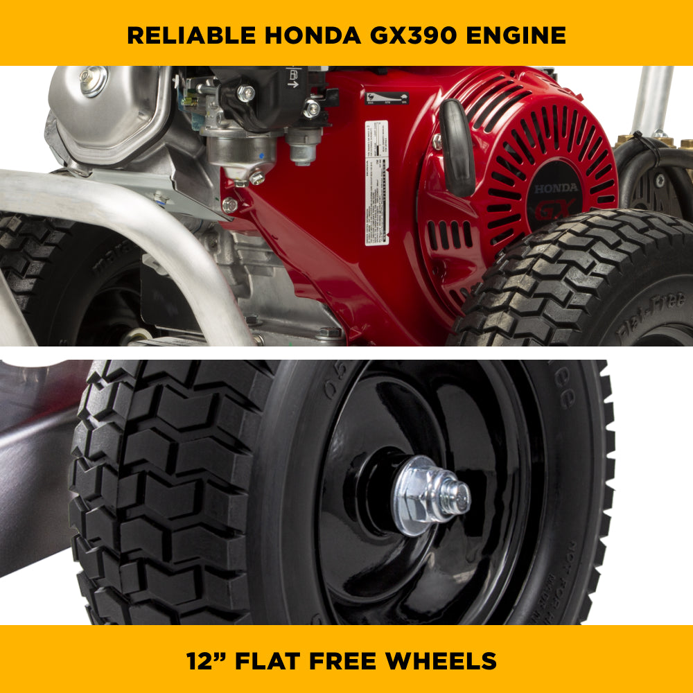 This BE Power Equipment 3200PSI Pressure Washer is engineered to handle even your toughest jobs commercial or residential. Powered by Honda GX390 engine delivers 3200PSI for tackling your toughest job.