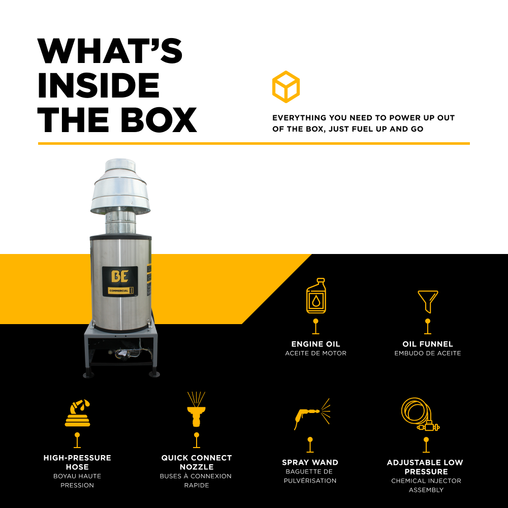 Industrial grade accessories included are a 50 foot high-pressure hose, spray gun wand assembly, and five spray nozzles.