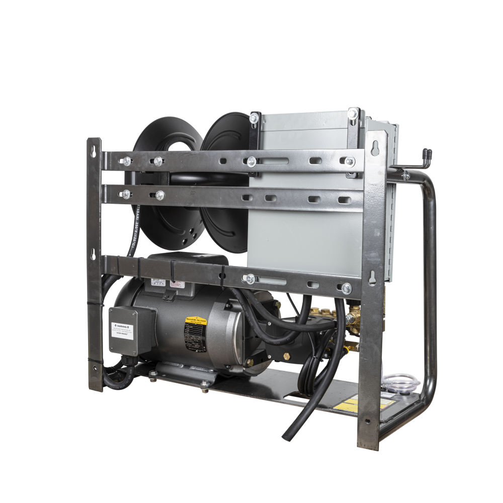 Powder coated steel frame mounts securely to a wall with storage for accessories including a hose reel for the high pressure hose.