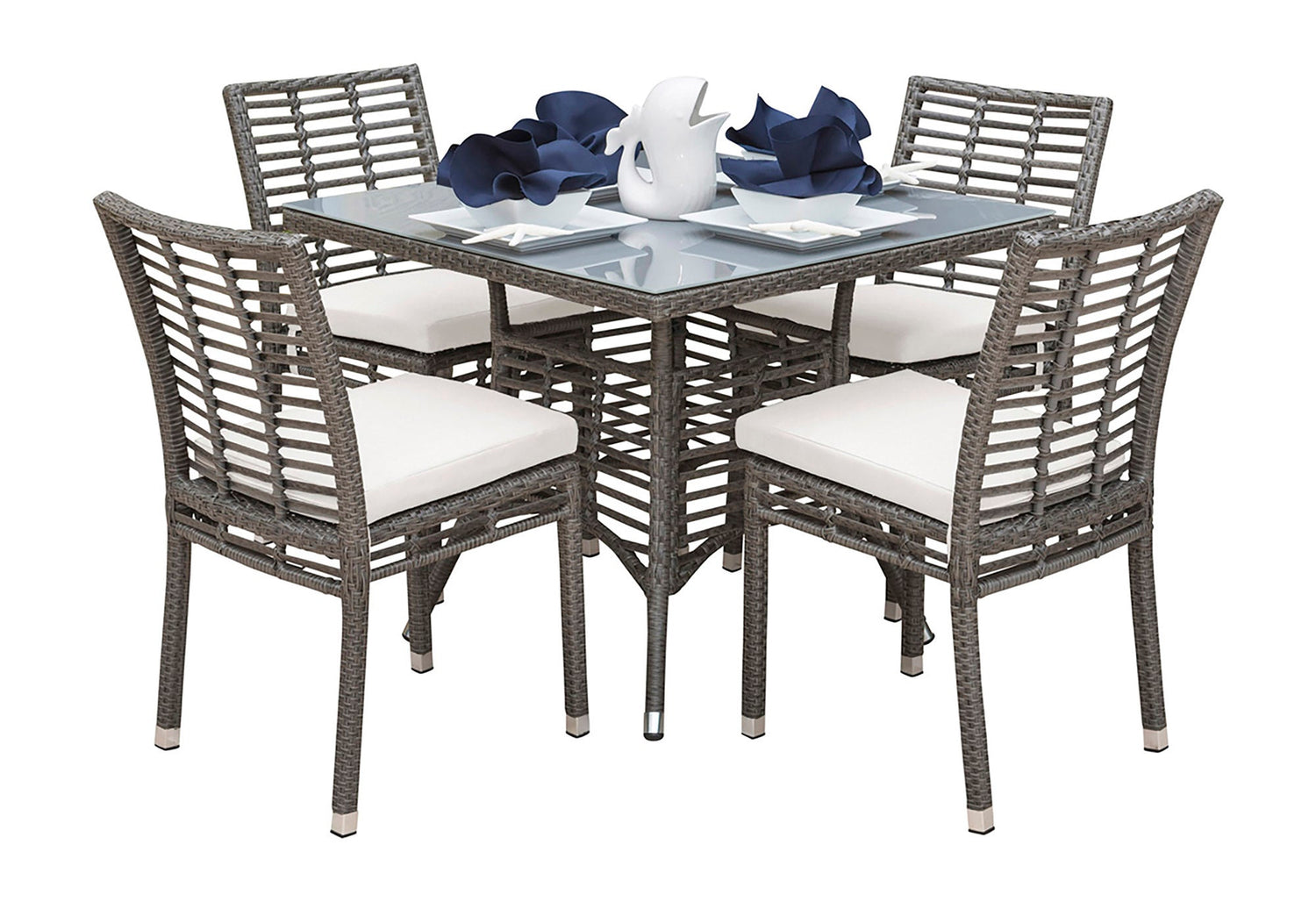 Upgrade your outdoor dining area with the Panama Jack Graphite 5-Piece Side Chair Dining Set with Cushions. The set features see-through grey fiber hand-woven over aluminum frames, providing a sleek and modern aesthetic for your backyard or patio. Built to withstand corrosion and scratching, the set is ideal for any outdoor dining space, and can be combined with other pieces from the Graphite collection to create a fully customized outdoor dining experience. The set comes with off-white outdoor polyester fabric cushions, and you have the option to choose from our variety of Sunbrella outdoor fabric options for added comfort and style. The dining table includes a tempered glass top for effortless completion of your outdoor dining area. Order now and relish in a comfortable and stylish dining experience in your own outdoor sanctuary.