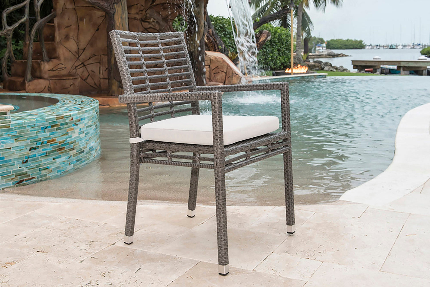 Looking for a sleek and modern addition to your outdoor dining space? The Panama Jack Graphite Stackable Arm Chair with Cushion is the perfect choice. Constructed from see-through grey fiber hand woven over aluminum frames, this armchair is resistant to corrosion and scratching, making it ideal for any outdoor setting. Choose from our off-white outdoor polyester cushion or one of many Sunbrella outdoor fabric options for added comfort. And when it's time to clean up, the stackable design makes for quick and hassle-free storage. Combine with any of the multiple dining tables from the Graphite collection to create an outdoor dining area that's perfectly suited to your needs.