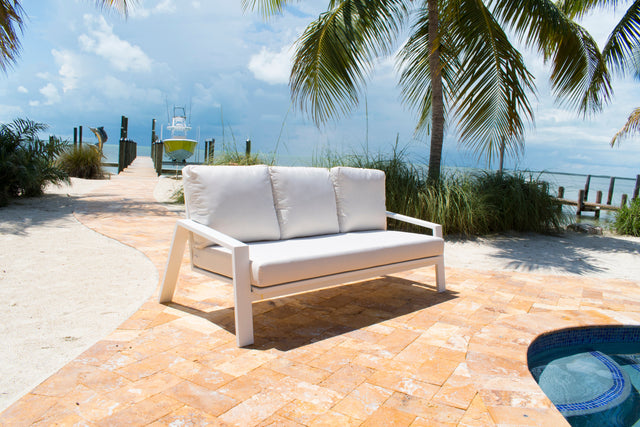 Experience the allure of the Mediterranean lifestyle with the Panama Jack Mykonos Sofa. Part of the Mykonos seating collection, this deep seating sofa is crafted from bright white aluminum frames that exude a modern and clean aesthetic, perfect for evoking the beauty of the Greek isles. The plush cushions offer a serene and tranquil spot for lounging under clear blue skies, while the sleek lines and angles on the frames provide a sophisticated touch to any outdoor space. Customize your Mykonos Sofa with one of our many Sunbrella outdoor fabric options to add your personal touch to this stylish piece. Elevate your outdoor living with the Panama Jack Mykonos seating collection.