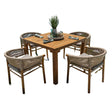 Crafted from solid acacia wood in a warm honey finish, the Panama Jack Corsica 5-Piece Square Dining Set is a must-have for any outdoor living space. This set is perfect for enjoying your favorite meals or cocktails while relaxing in style. The modern tan cording seat and backrest are designed to dry quickly, making it convenient for you to leave them outside without worry. Complete your outdoor oasis by pairing this set with other items from the collection. To restore the original golden teak color, simply apply light sanding and teak oil every few months. Perfect for patios, balconies, or poolside living areas, this dining set is sure to impress.