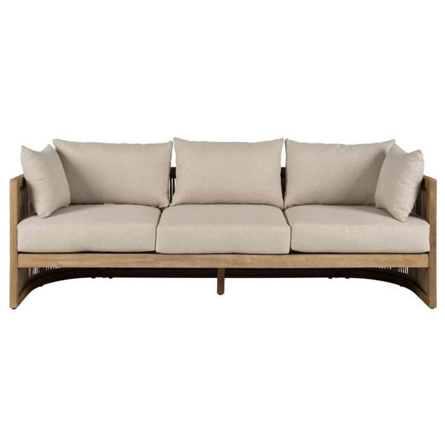 Relax in style with the Panama Jack Cabo Sofa, a perfect blend of comfort and modern design for your outdoor space. This elegant sofa features a sturdy aluminum inner frame, wrapped in beautiful Acacia wood for a natural and durable finish. The sofa is enhanced with tan rope detailing on the sides, adding a touch of contemporary flair to the design. Complete with plush cushions, the Cabo Sofa offers the ultimate relaxation experience for lounging or entertaining. Whether placed on a patio or by the pool, its weather-resistant construction ensures long-lasting use. Pair it with other pieces from the Panama Jack Cabo collection to complete your outdoor oasis.
