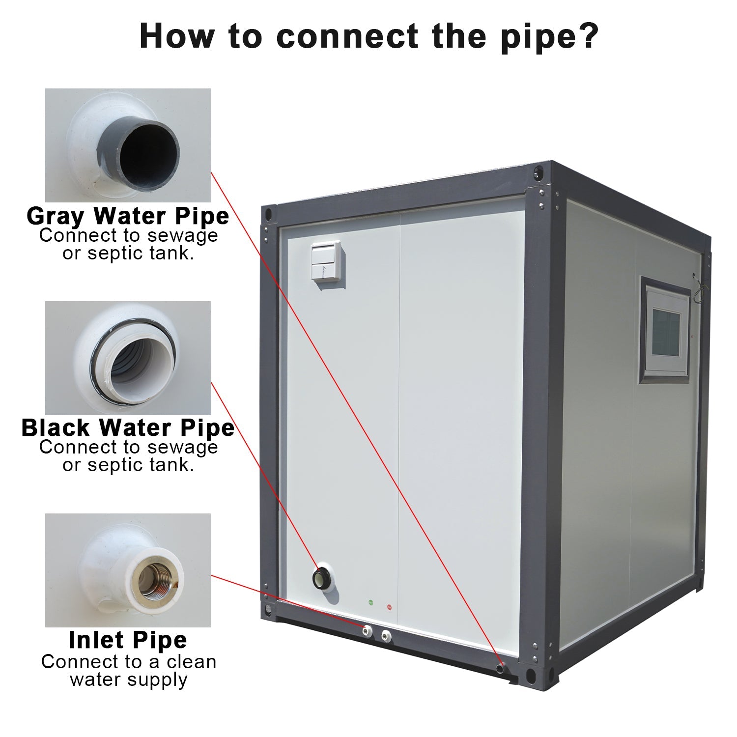 If this Portable Toilet with Fan-shaped Door Shower is used on a construction site, we recommend you connect toilets to the sanitary sewer system and connect cold water to the pipe system, and hot water to the heating burner. If not, you may need tanks outside the structure for waste.