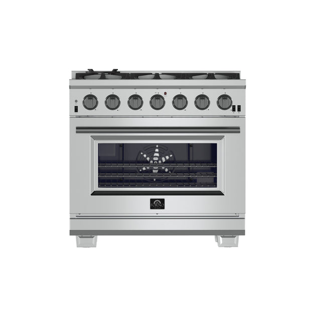 This 36" Pro-Style Gas Range by Forno offers a 6 Defendi Italian Brass Burner cooktop and a 5.36 cu. ft. oven. The range also features cast iron grates, convection fan and halogen lighting.