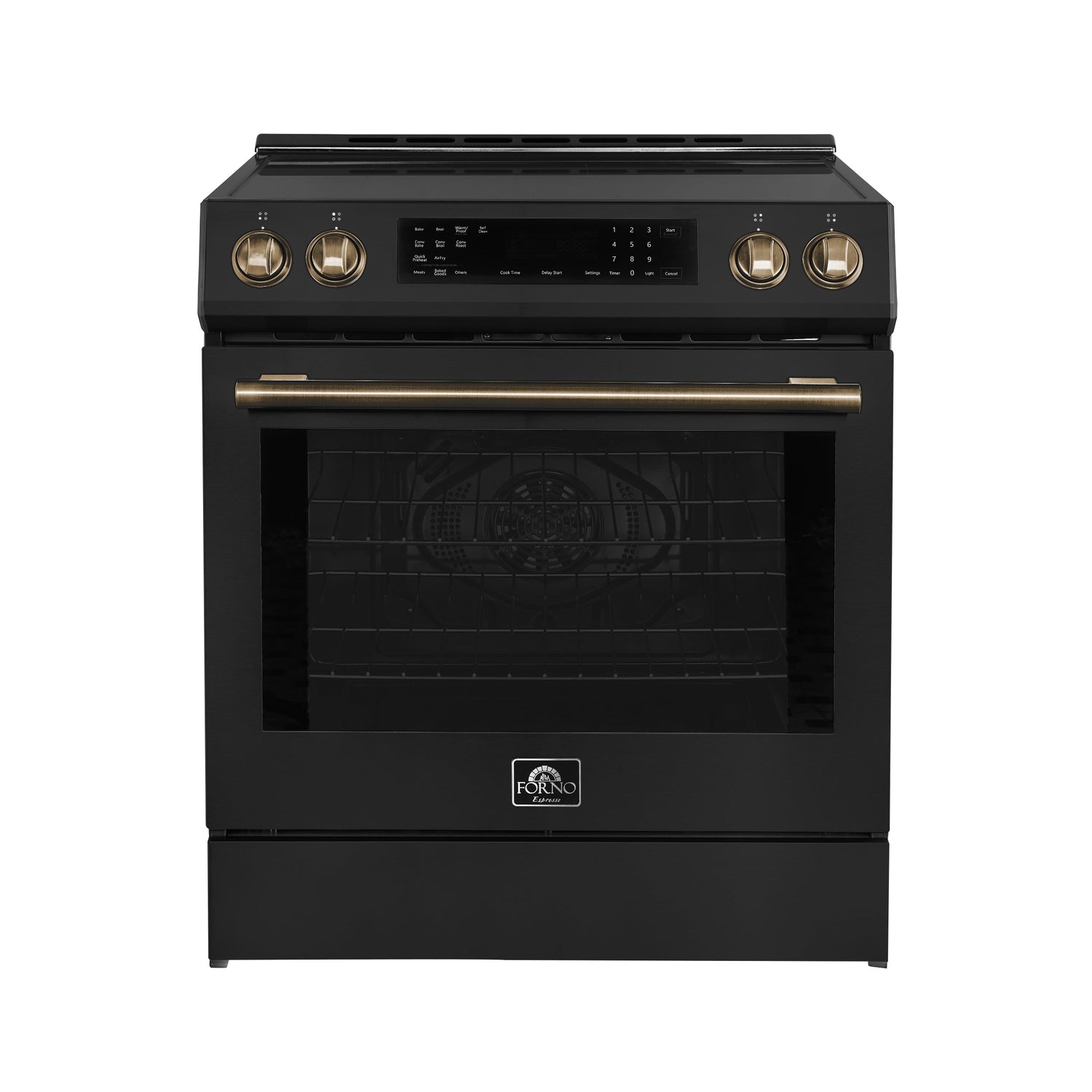FORNO Espresso Donatello 30" 5 cu. ft. Induction Range with Air Fry and Self-Clean in Black and Antique Brass Handles, FFSIN0905-30BLK