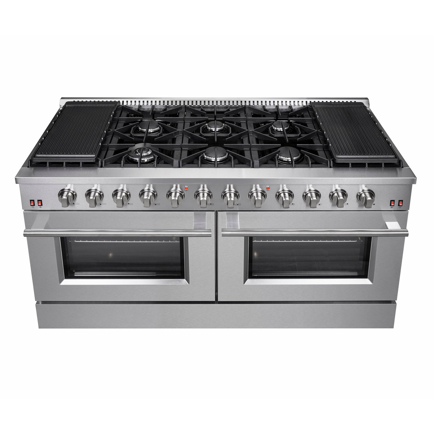 This 60 Inch Professional Freestanding Gas Range by Forno offers a 10 Sealed Burners Cooktop and a large 8.64 cu. ft. convection oven. The range also features cast iron grates, a convection fan, and zinc control knobs.