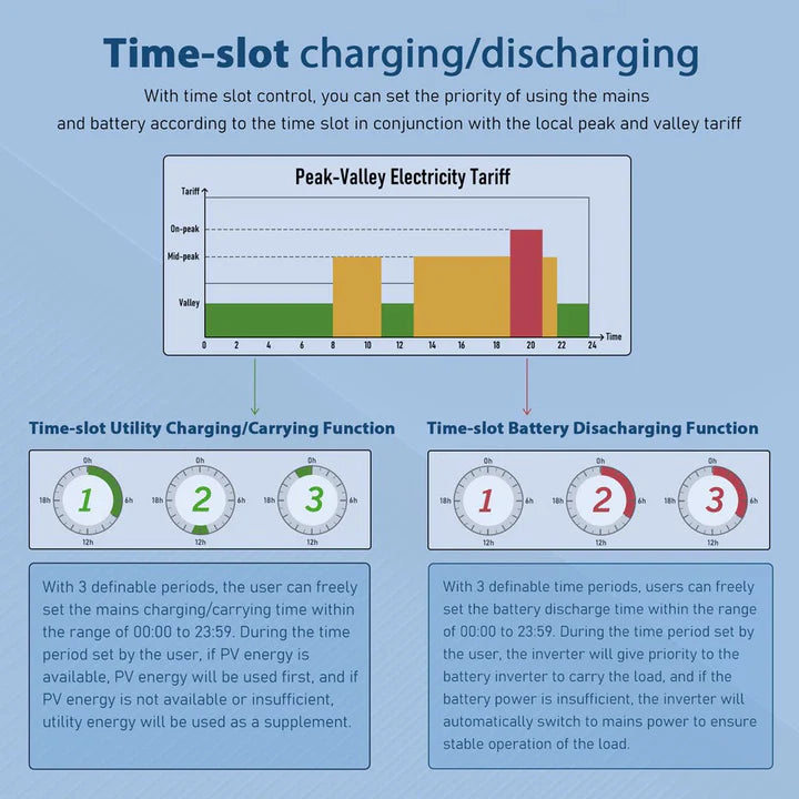 • Time-Slot Charging/Discharging Function: Equipped with a time-slot charging and discharging feature, the inverter allows users to set specific periods for charging and discharging based on local peak and valley electricity tariffs, optimizing the use of utility power and solar energy.