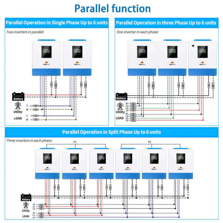 • Parallel Kit: Capable of connecting up to 6 units in parallel for a total power output of 30kW. You can achieve 120V single-phase output with one unit, 120V/240V split-phase (with more than two units), and 208V three-phase support (with more than three units). This expands both power and surge capacity.