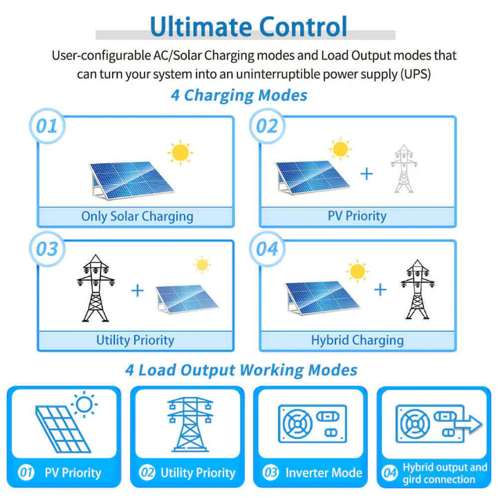 • Four Charging Modes & Output Modes: Offers four charging modes—AC Priority, Solar Priority, Only Solar, and Mains & Solar hybrid charging. Additionally, there are four output modes—PV priority, utility priority, inverter priority, and hybrid output—to meet different energy requirements.