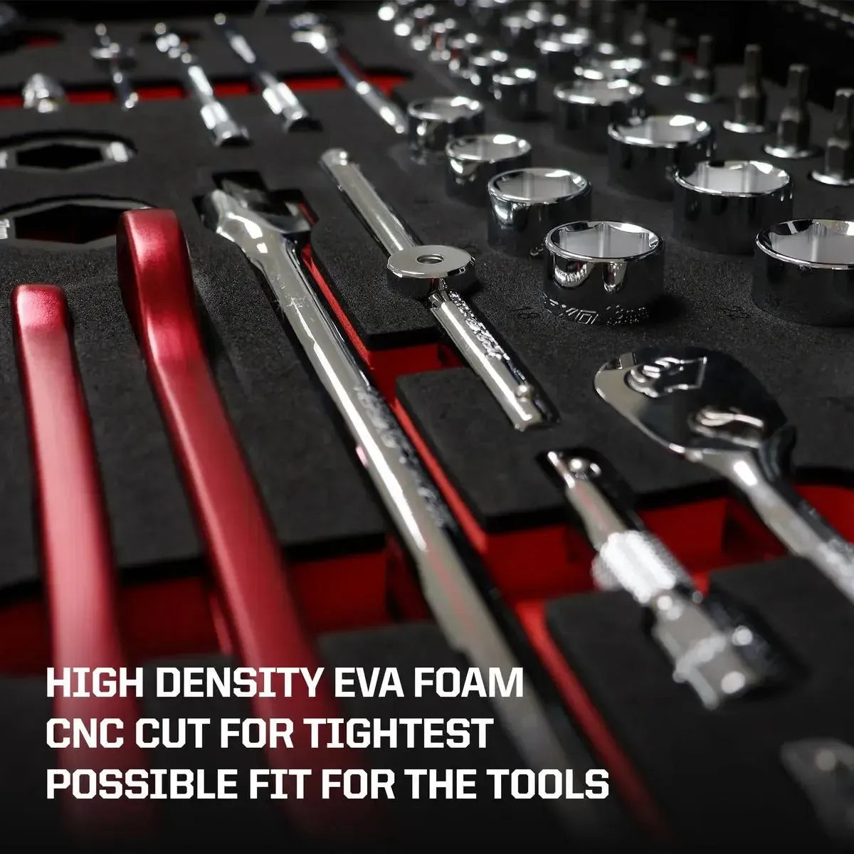 Each tool fits precisely within three EVA foam inserts, preventing shifting and keeping everything in place even on bumpy rides. A mirror chrome finish on the tools protects them from corrosion and makes cleaning a breeze. Inside, you’ll find 90-tooth ratchets, extensions, 6-point sockets, ergonomic wrenches, screwdrivers, pliers, and more, all marked for easy identification—perfect for tight schedules and quick repairs.