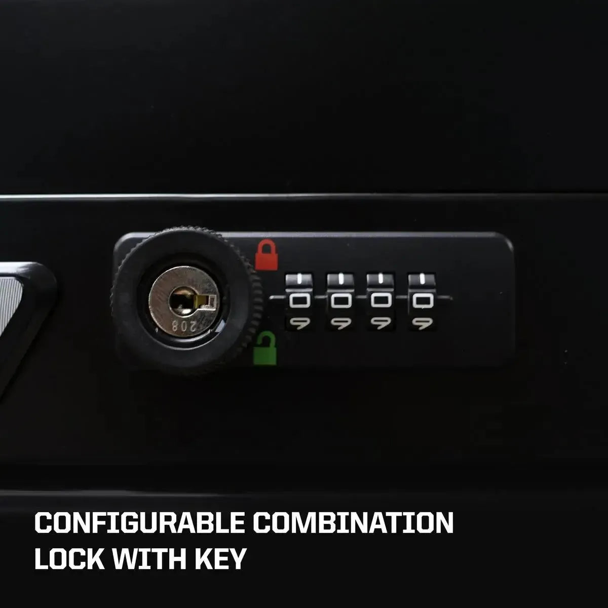 This tool box is constructed from heavy-duty 20-gauge steel, with a full-width metal hinge pin connecting the lid to the chest for added strength. The powder-coated finish provides durability to last a lifetime. The box includes two comfortable handles for easy carrying, heavy-duty ball bearing drawer slides for smooth access, and both a key lock and resettable digit-lock for added security.