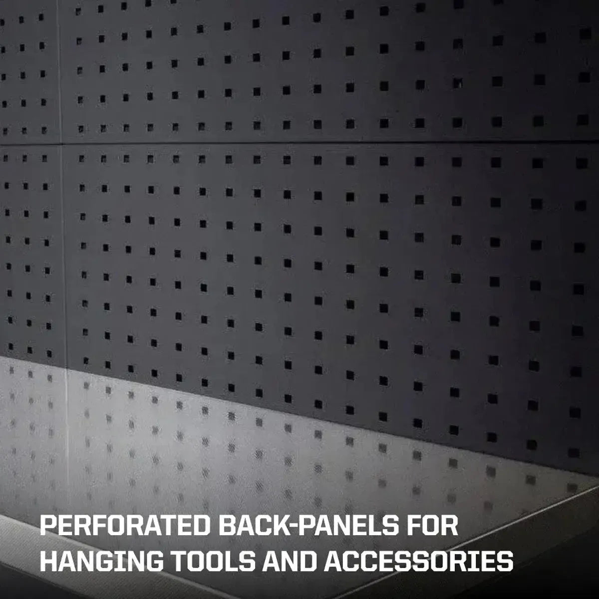 For overhead storage, four 26” Cupboards (MSC260001DG2) with gas lift mechanisms offer easy access and secure closure, while four 26” Perforated Back Panels (MSN001-1DG2) provide ample space for hanging tools and accessories. The system also includes side brackets (MSN003-RL) for a secure and stable installation.