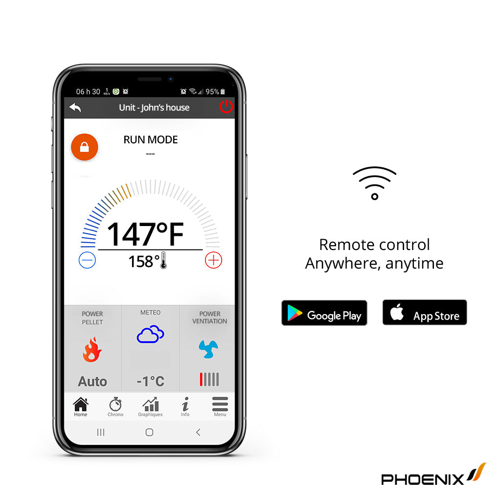 It can contain 5 bags of pellets (200lbs) for an autonomy of 3 to 10 days (depending on your energy demand). It is entirely programmable and lets you decide when it is on or off.