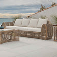 The Ruby Sofa blends modern aesthetics with durable outdoor design. Built with a sturdy aluminum frame in a silver walnut finish, it features handwoven Ecolene Kubu Mushroom synthetic fibers for a unique open-weave look. The Sunbrella cushions provide luxurious comfort while resisting weather and fading, making this sofa perfect for any outdoor space.