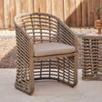 The Ruby Dining Armchair brings a modern organic aesthetic to outdoor dining spaces. Featuring an aluminum frame in a silver walnut finish, this chair is handwoven with Ecolene Kubu Mushroom synthetic fibers for durability and a unique open-weave design. The plush Sunbrella cushion ensures exceptional comfort and all-weather resilience. Perfect for elegant patio and terrace dining.