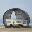 The Sparta Daybed redefines outdoor relaxation with its bold, sculptural design and premium craftsmanship. Featuring a durable handwoven synthetic fiber frame, this statement piece is designed for both elegance and longevity. The Sunbrella cushions offer plush comfort and superior weather resistance, ensuring year-round enjoyment. Its arched open-weave canopy provides shade while allowing for natural airflow, creating the perfect outdoor retreat. Available in Black and Kubu Mushroom, it seamlessly integrates into any luxury patio, poolside, or garden setting.