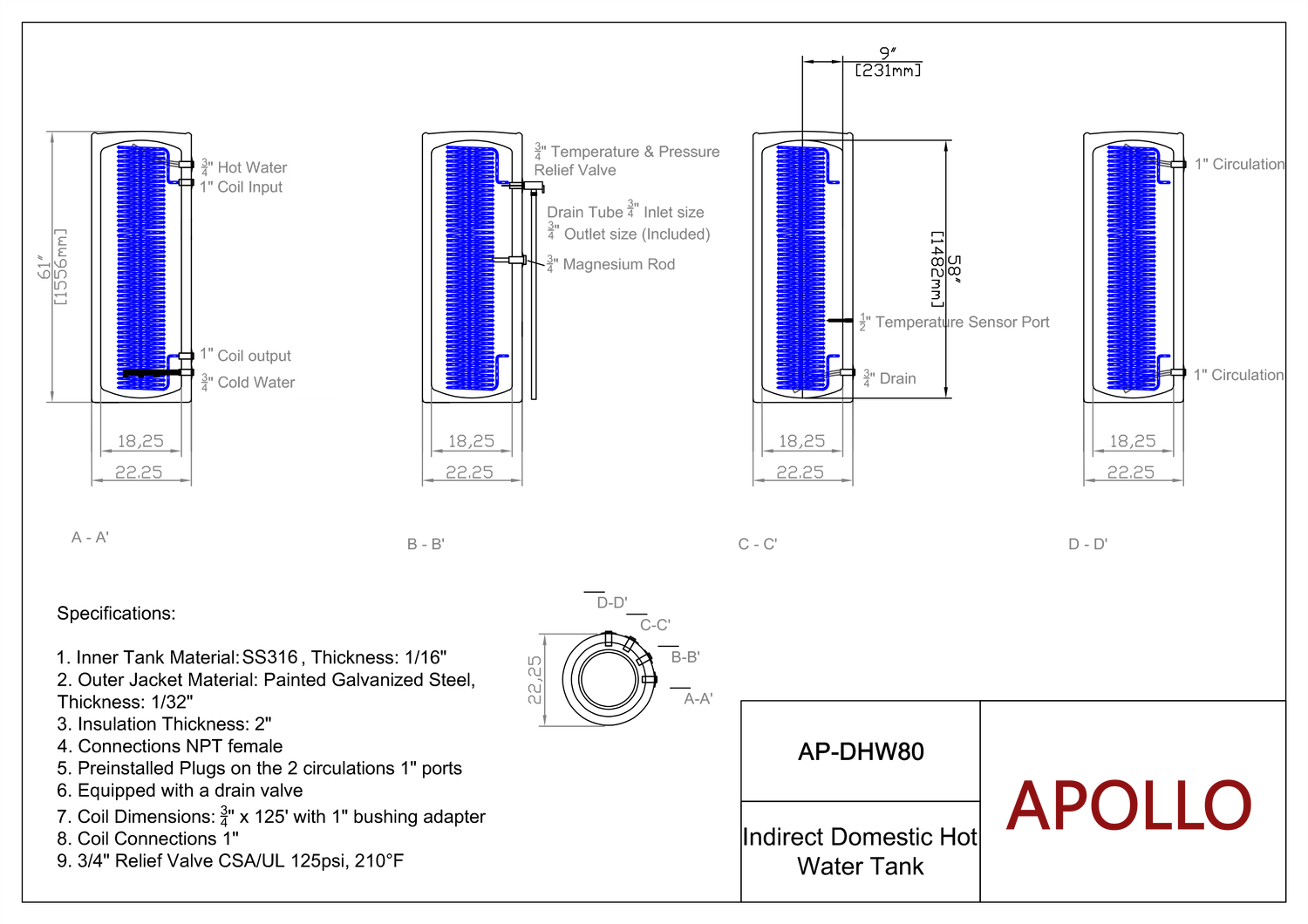 The APOLLO DHW80 is a high-efficiency indirect domestic water heater designed to work seamlessly with boilers or heat pumps, providing reliable hot water for both residential and commercial applications. Built with durability and performance in mind, this tank features an inner tank made of 316 stainless steel (1/16" thickness) and an outer jacket of painted galvanized steel (1/32" thickness). The larger coil (3/4" x 125') ensures improved heat transfer efficiency, while the 2" polyurethane foam insulation minimizes heat loss and prevents condensation.
